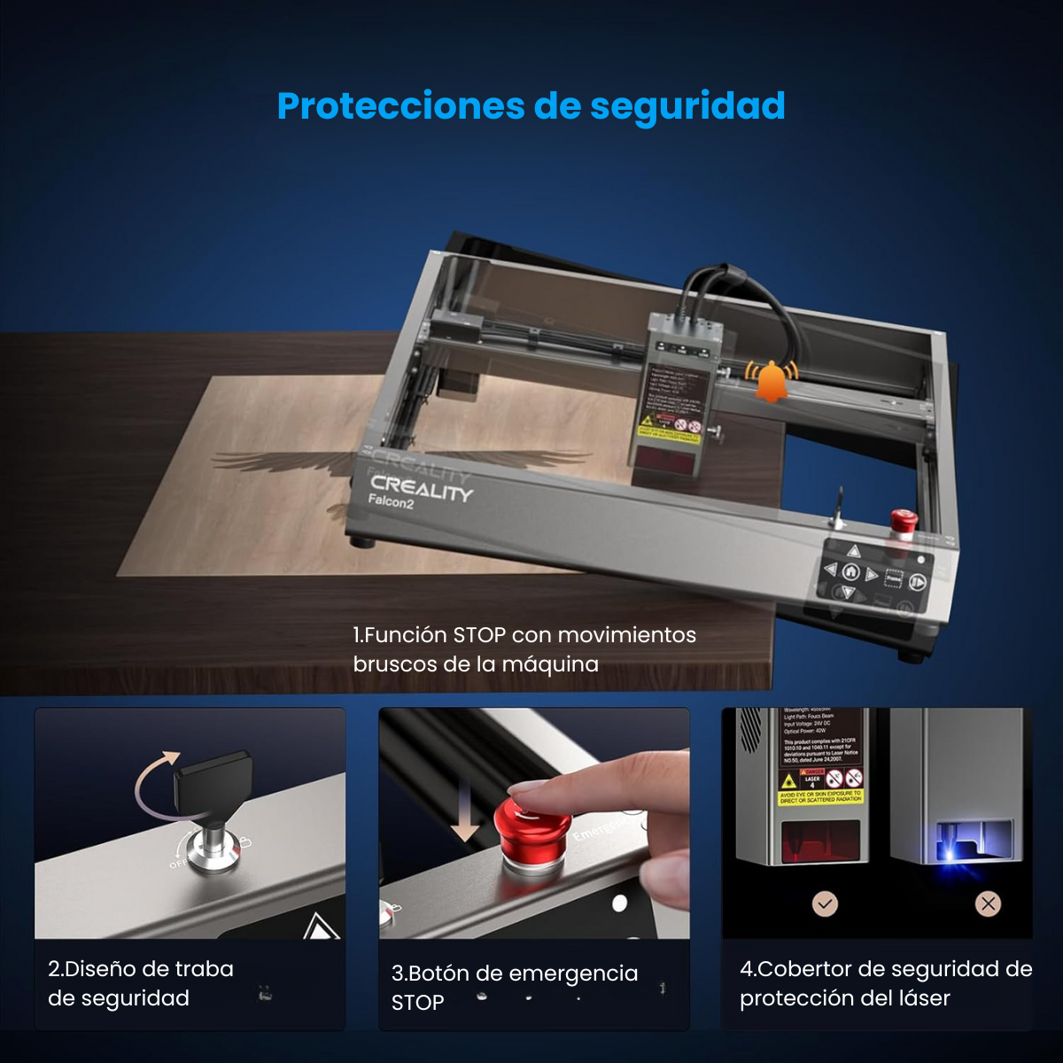 Otras características incluyen una estructura de aleación de aluminio sólida para garantizar una estabilidad excepcional incluso durante operaciones de alta velocidad, un sistema de rieles y ruedas resistentes para mantener el movimiento sincronizado y estable, almohadillas de silicona para evitar deslizamientos, y una capacidad de almacenamiento integrado para mantener todo organizado. Con ajuste manual para adaptarse a diferentes tamaños de mesas y con elevadores ajustables de múltiples segmentos para objetos más altos, la Creality Falcon2 se presenta como una opción versátil y práctica para aquellos que buscan una solución de grabado láser de alta calidad.