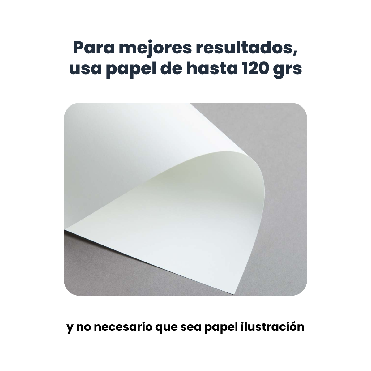 – Te recomendamos que uses un papel con gramaje superior a 80 gr para obtener una mejor calidad a nivel visual.