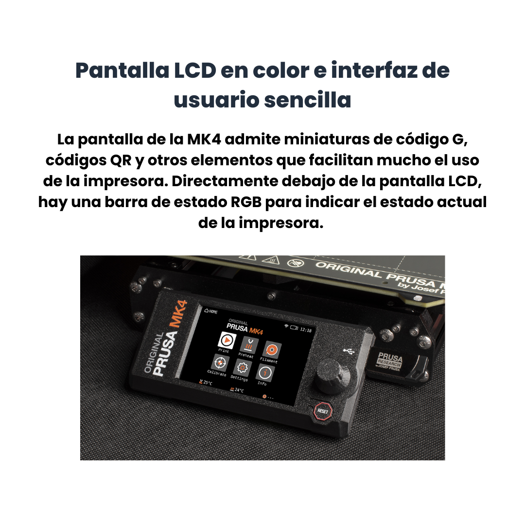 La pantalla de la MK4 admite miniaturas de código G, códigos QR y otros elementos que facilitan mucho el uso de la impresora. También hemos rediseñado muchos de los menús existentes y hemos hecho un pie de página personalizable. Directamente debajo de la pantalla LCD, hay una barra de estado RGB para indicar el estado actual de la impresora. Junto a la pantalla LCD, hay un puerto USB-A para unidades flash USB estándar. -