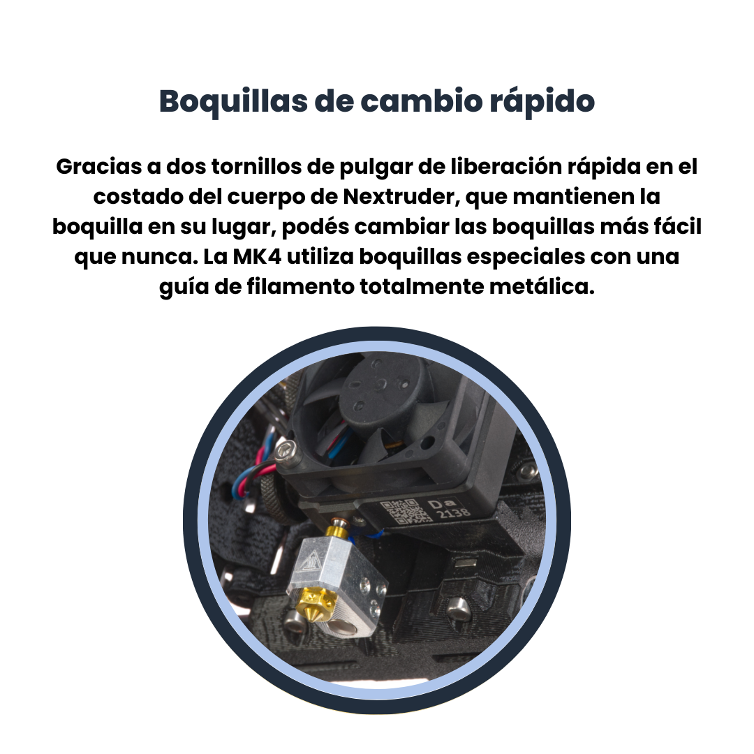 Gracias a dos tornillos de pulgar de liberación rápida en el costado del cuerpo de Nextruder, que mantienen la boquilla en su lugar, puedes cambiar las boquillas más fácilmente que nunca. La MK4 utiliza boquillas especiales con una guía de filamento totalmente metálica (sin tubos de PTFE en ninguna parte), lo que mejora la fiabilidad general de la impresora. El adaptador sencillo Nextruder a V6 está disponible. -