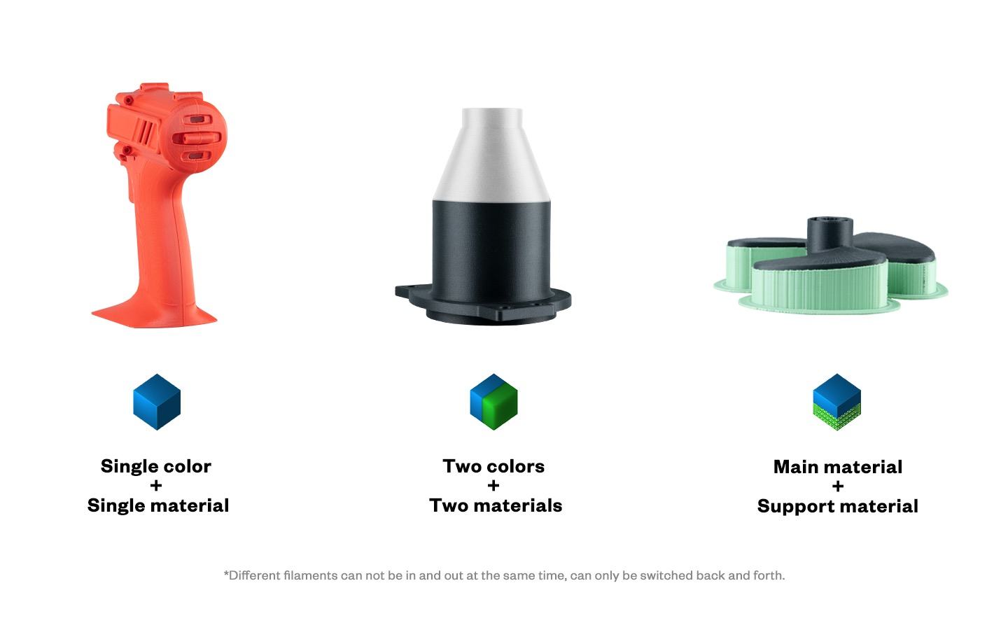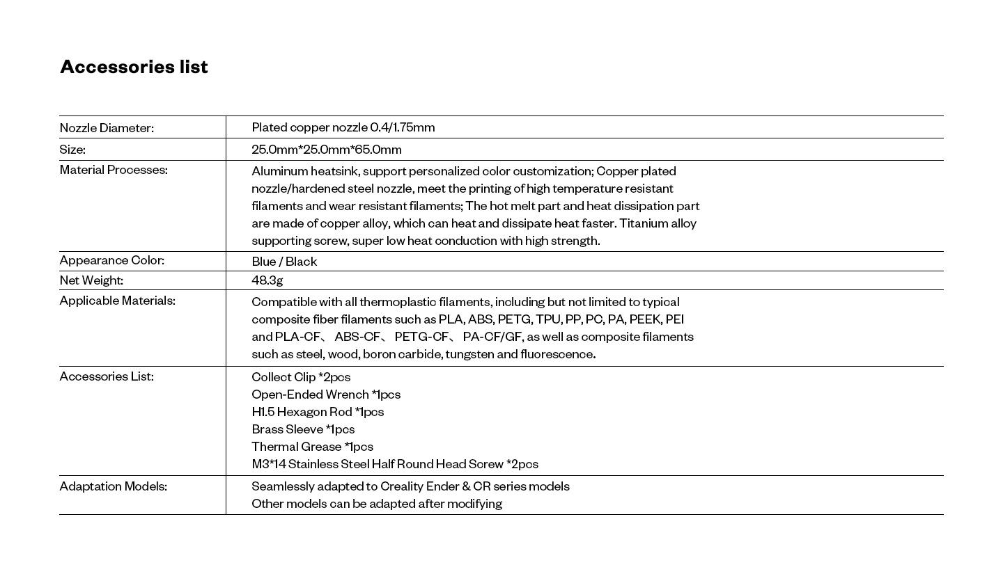 Compatible con todos los filamentos termoplásticos, incluidos, entre otros, los típicos filamentos de fibra compuesta como PLA, ABS, PETG, TPU, PP, PC, PA, PEEK, PEI y PLA-CF, ABS-CF, PETG-CF, PA-CF /GF, así como filamentos compuestos como acero, madera, carburo de boro, tungsteno y fluorescencia.