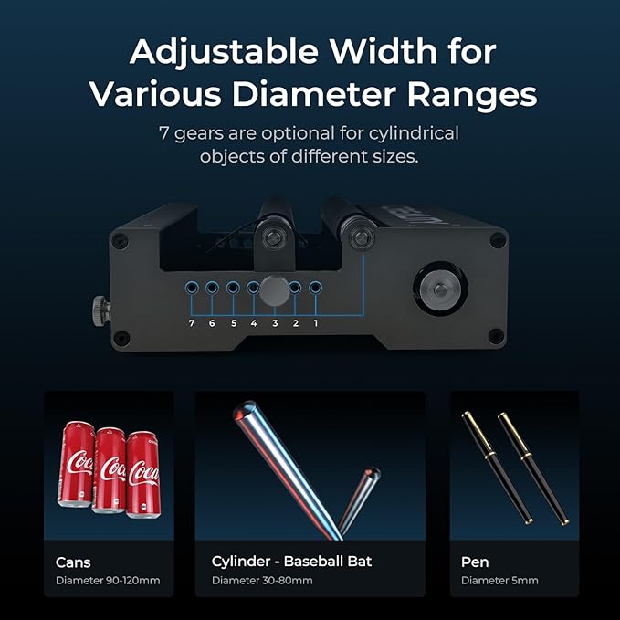 Perfecto para grabado cilíndrico: el rodillo giratorio láser se puede utilizar para objetos cilíndricos o cilíndricos de pequeño diámetro como troncos, tazas, botellas, tuberías, cuencos, guitarras, tambores y tubos.