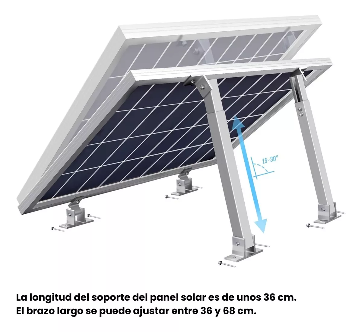 Este soporte es un soporte ideal para posicionar los paneles de forma inclinada hacia el sol obteniendo de esta forma hasta un 25% más de eficiencia, puede ajustarse de forma flexible entre un ángulo de 15º a 30º.
